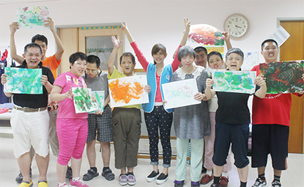 每個心路的孩子懷有一個幸福的夢想,在兩位畫畫老師的示範教學以及帶領下,青年們拿起滾輪刷,沾上調色盤內繽紛的顏料,依心之所嚮緩緩將眼前白色的圖畫紙上色,也為自己的生活填上美麗的色彩。幸福大使陳妍希也親身教學,拿起桌上的蠟筆,一起與青年們共同作畫,並親切地聆聽每一位青年分享自己的作品。青年們在幸福大使的陪伴下,度過了一堂暖心幸福的畫畫課。