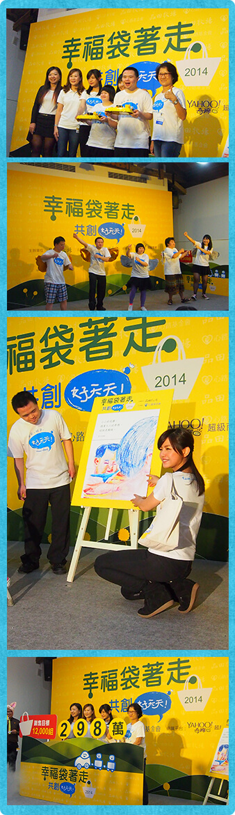 心路青年以熱力四射的射手舞,為第三屆幸福袋著走記者會義賣活動揭開序幕。日系樂活風幸福提袋也在幸福大使陳妍希的登場後正式亮相!不僅如此,熱心公益的幸福大使陳妍希更獻上自己的手繪作品給心路基金會,表達對每一位心路孩子的關懷。