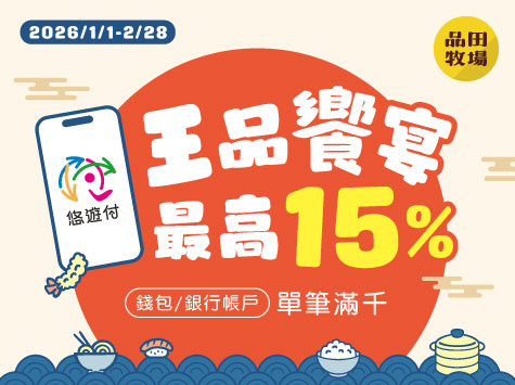 2026/1/1-2/28到【品田牧場】使用悠遊付錢包或綁定銀行帳戶付款,最高享 15% 悠遊付回饋金